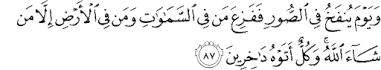 27.87 And moment yufakha / is inflated in the suuri / badness, then those in the samaawaat / higher consciousness and the ardh / lower consciousness will be fafazi'a / horrified, except for whom Allah wills. And all shall come to Him humbled.