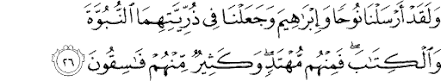 57.26 And certainly, We sent Nuhan / who has strong kindness and compassion (to the ignorant) and Ibraheem / who abide to the truth and We placed in his zurriyati / off-springs of early developed thoughts, the nubuwwah / those who pronounce and establish (news of the ghaib) and the kitab / inherent script; and among them is he who is guided, but many of them are disobedient (to Allah's command).